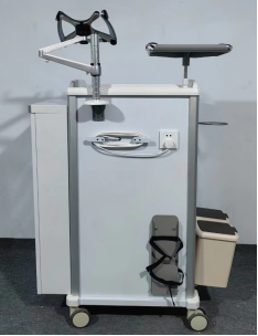 6、承重车体采用铝合金立柱,要求一体成型,自带轨道槽体,车体左上侧设有一个手写板,左下侧可悬挂两个脚踏式方形垃圾桶,右侧配有一个独立门式存储柜,可放内窥镜4把,独立存储柜可以采用独立数字电子密码锁,柜门采用液压静音铰链,柜门关闭后不会自动开启;